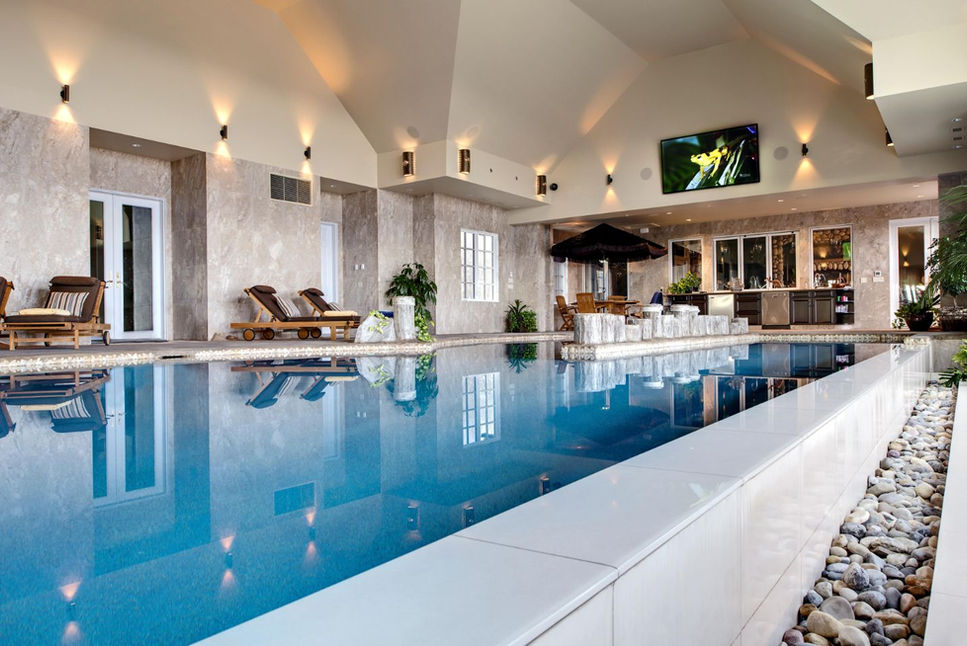 Class dining room and spacious kitchen with opening serving windows to the pool is accented with River Rock